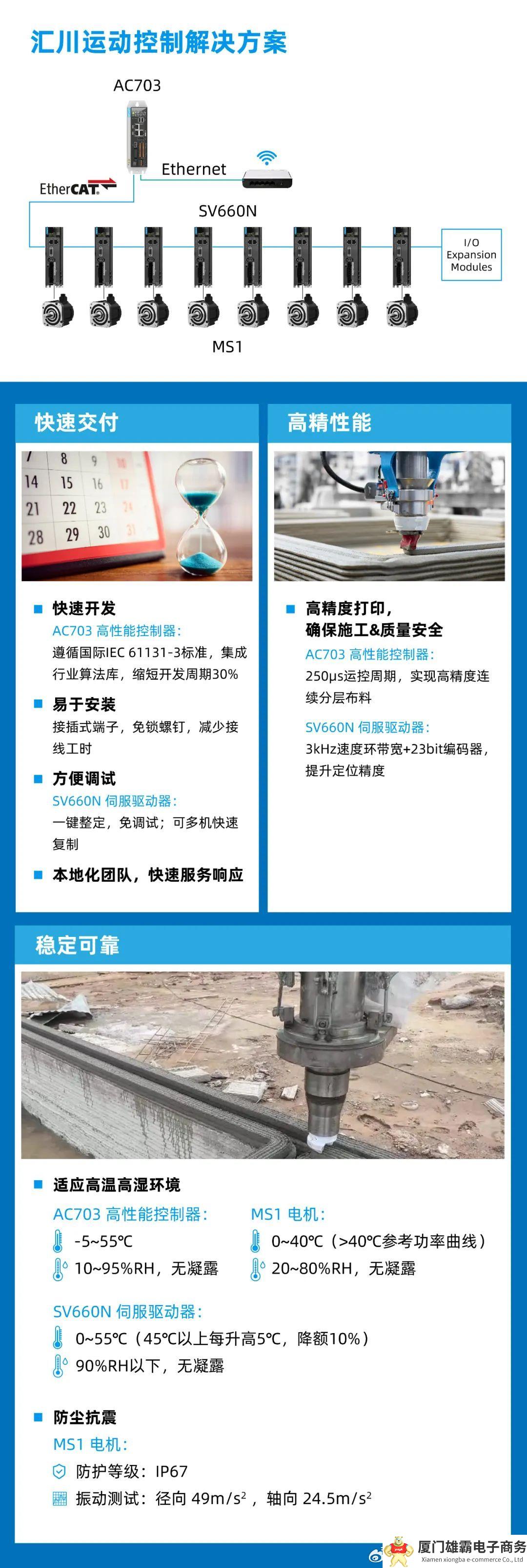 汇川运动控制解决方案,不仅可以帮助3D建筑打印机呈现完美状态,同时亦适用于各式各样的大型建筑装备。面对日益激烈的全球化市场竞争,汇川将不断突破创新,助力建筑装备企业在全球战略中保持领先地位。