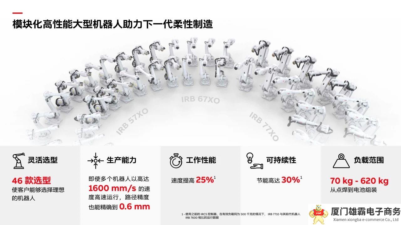 ABB机器人业务部全球总裁马思康说到,随着企业为了提升生产力、达成可持续发展目标而引入新技术和新设备,我们设计出了模块化大型机器人系列产品,提供客户更合适的机器人选型,帮助他们高效地开展业务。凭借市场上最全面的产品组合:机电一体化平台、工业机器人、协作机器人和自主移动机器人(AMR),全新的大型机器人系列产品进一步扩充了我们的产品线,协助客户解决劳动力短缺问题,同时助力客户在可持续经营模式下保持市场竞争力。