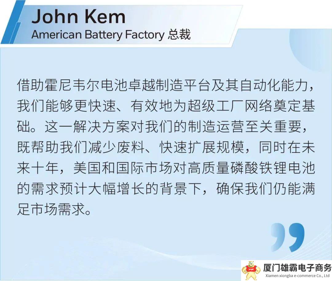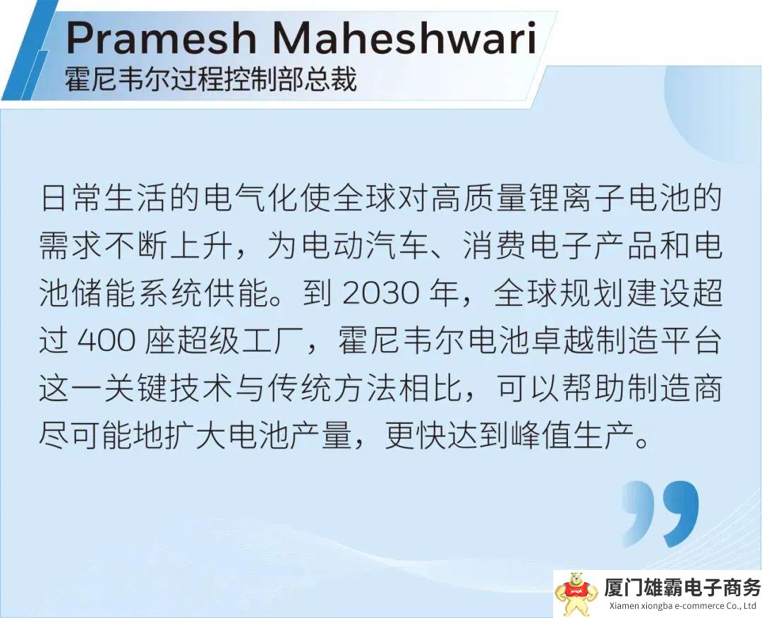 利用自动化技术推动全球电气化进程,顺应了霍尼韦尔围绕自动化和能源转型等关键趋势进行的业务重组。作为全球能源转型的重要参与者,霍尼韦尔正在运用自身在工业自动化、网络安全物联网(IoT)、物料处理、楼宇自动化和安全解决方案领域完整的业务组合,帮助电池制造商尽快将可靠的产品推向市场,以满足预期的电池需求。