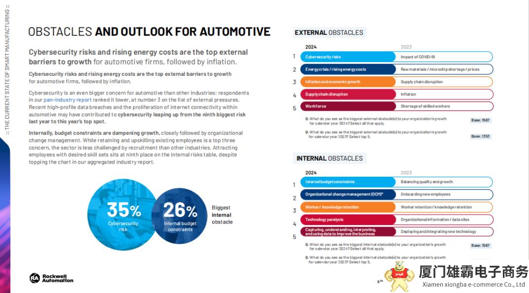 近日,作为工业自动化、信息化和数字化转型领域的全球领先企业之一,罗克韦尔自动化发布第九版年度《智能制造现状报告:汽车版》。这份全球调研共收到182位负责人的回复,覆盖来自15个主要制造业国家和地区的汽车制造商和汽车供应商。