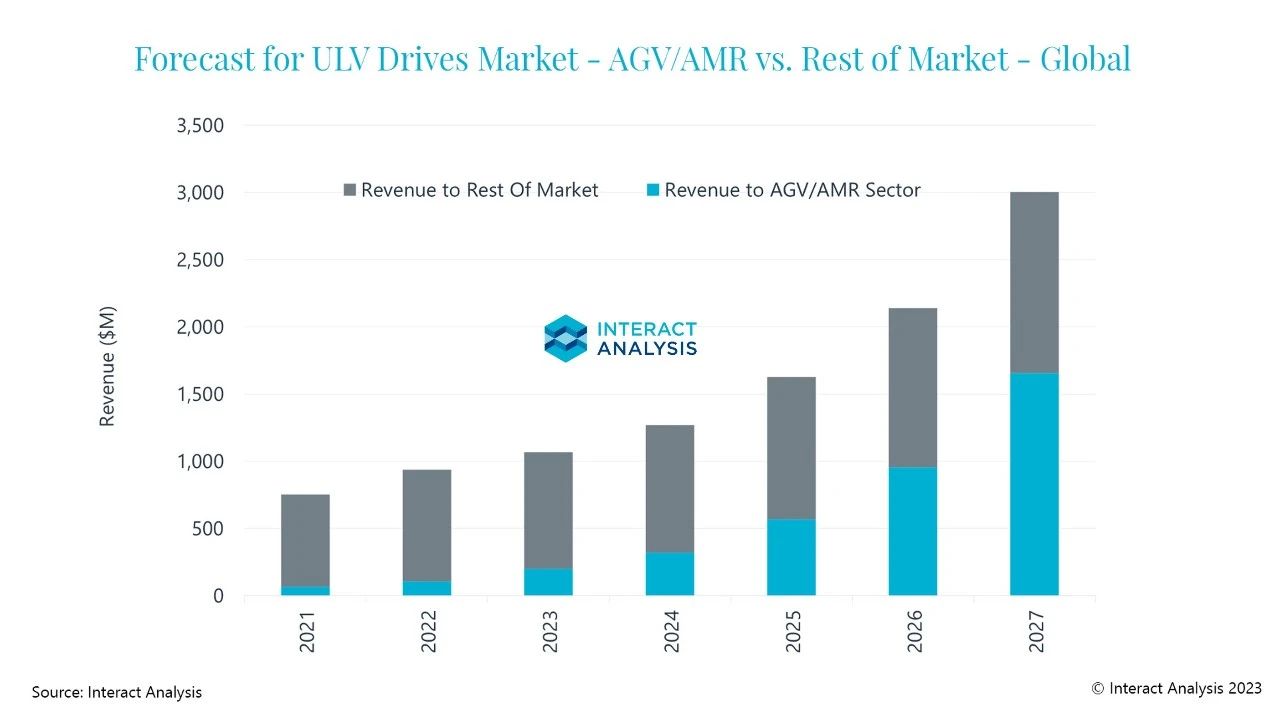 在未来五年内,销往AGV和AMR领域的超低压变频器预计将以71%的复合年增长率增长,这是Interact Analysis在工业自动化所有研究报告中增长最快的领域。预计到2027年,销往AGV/AMR应用的超低压变频器将占据超低压变频器整体市场营收的约55%。这表明AGV和AMR应用是一个快速增长且重要的市场,超低压变频器在这些应用中的需求将显著增加。
