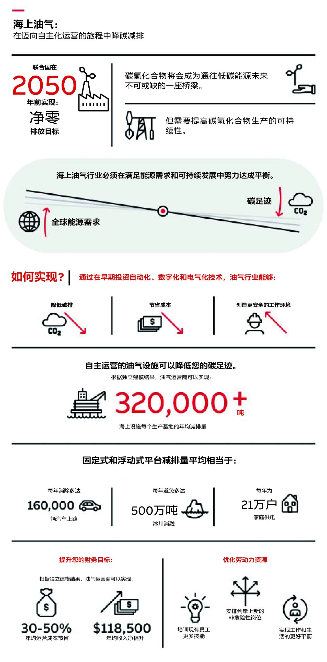 - ABB研究表明海上油气公司通过自主化运营平均每年每个生产设施有望降低30万吨的碳排放[1],这相当于15万辆汽车的排放量[2]。