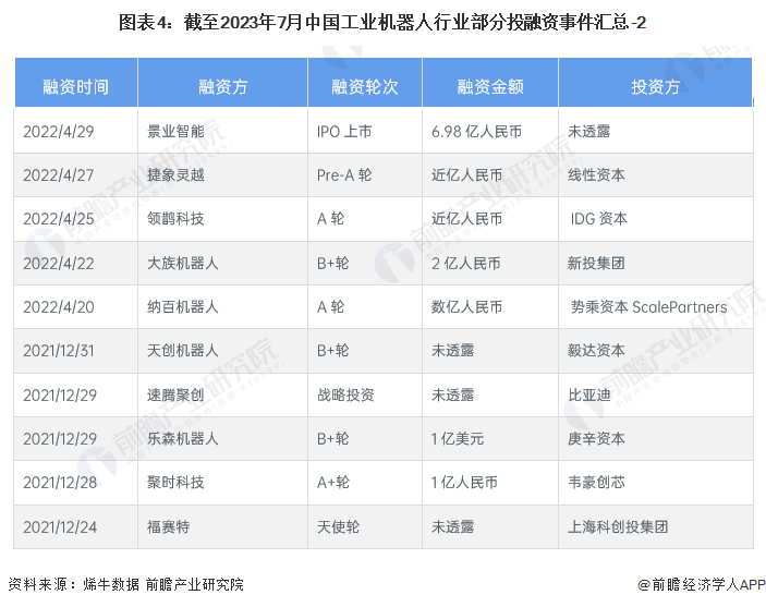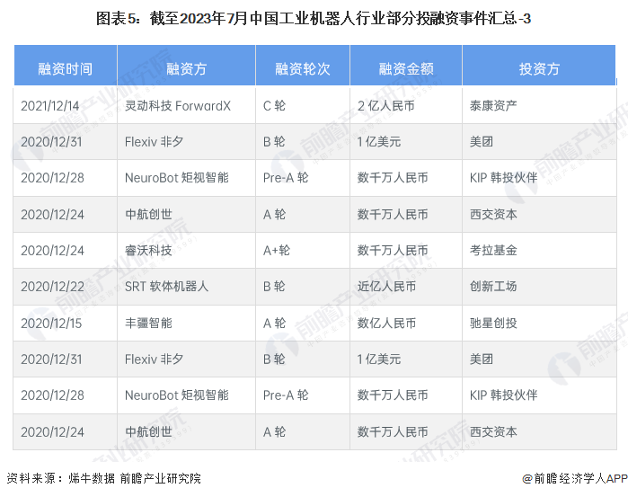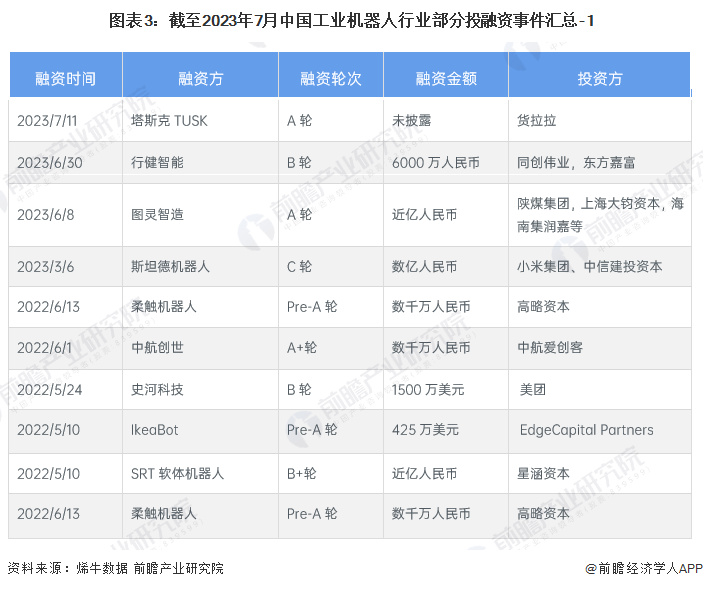截至2023年5月,中国工业机器人行业投融资情况如下所示: