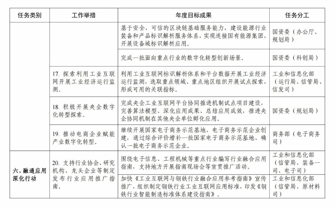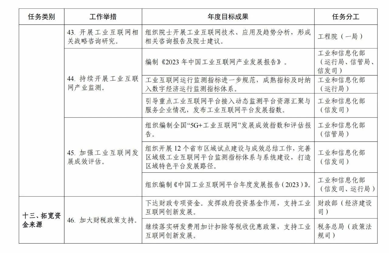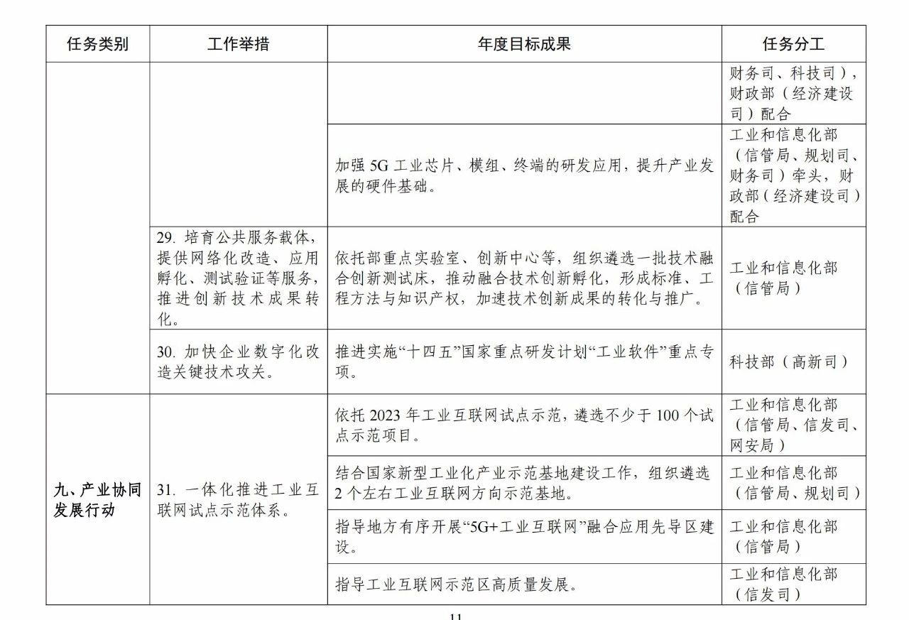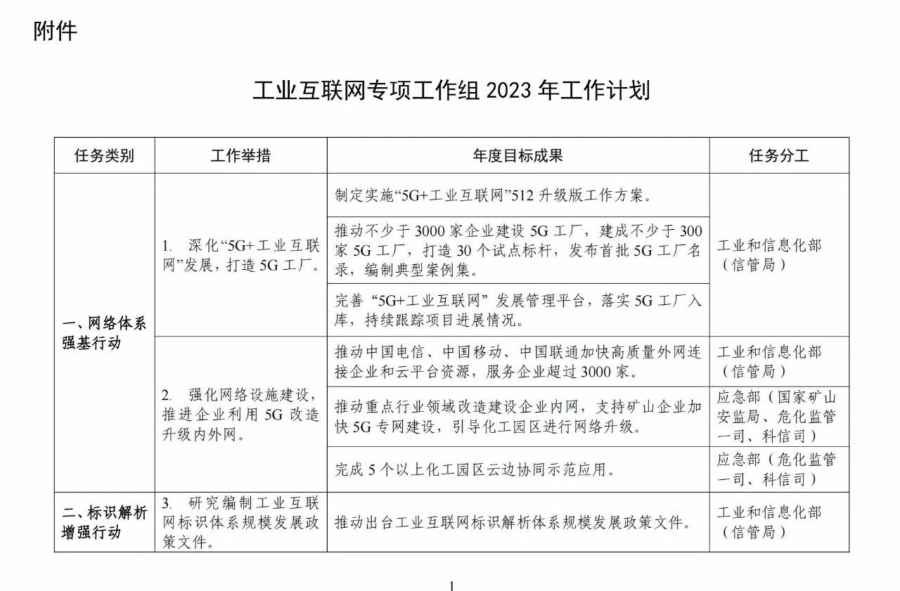 6月21日,工信部印发《工业互联网专项工作组2023年工作计划》。工作计划围绕政策体系、基础设施、创新体系、融合应用、产业生态等方面提出11项重点行动,54项具体举措。