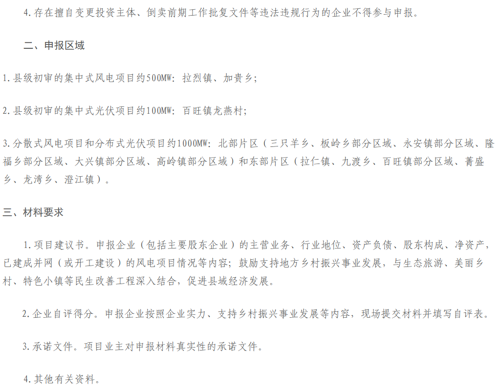 3.分散式风电项目和分布式光伏项目约1000MW:北部片区(三只羊乡、板岭乡部分区域、永安镇部分区域、隆福乡部分区域、大兴镇部分区域、高岭镇部分区域)和东部片区(拉仁镇、九渡乡、百旺镇部分区域、菁盛乡、龙湾乡、澄江镇)。