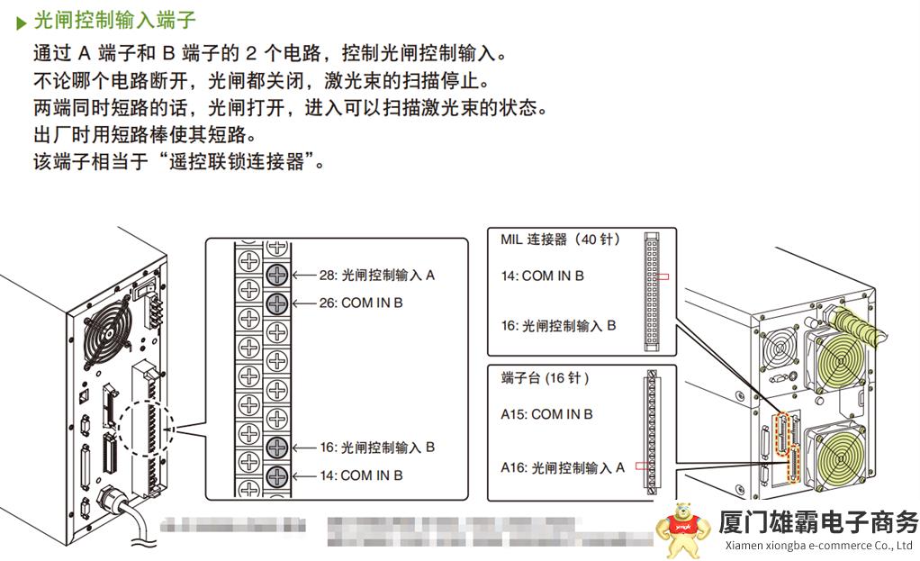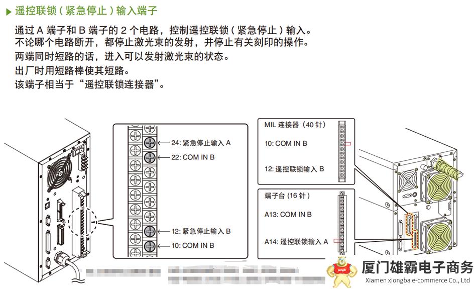 每个3B类及4类激光系统应安装有遥控联锁连接器,当连接器的终端开路时,可达辐射不应超过可适用的1M类或2M类的AEL。遥控联锁 ( 紧急停止 ) 输入端子 ( 遥控联锁接口 ) 连接到紧急停止开关或类似装置上,防止紧急情况下激光的辐射。要打开紧急停止输入端子,请停止激光发射。( 由于联锁功能需要手动重设以恢复操作。)