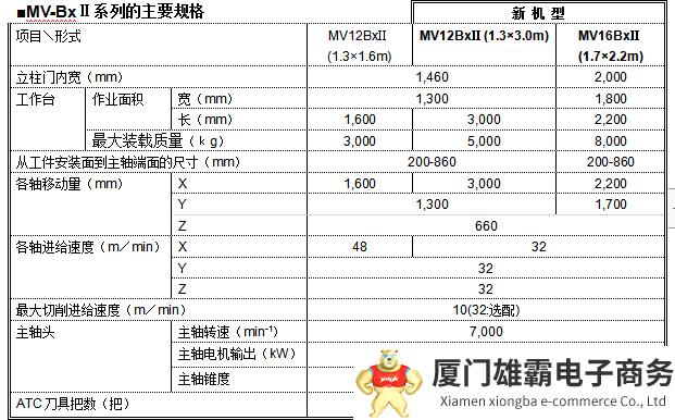 MV16BxⅡ(1.7×2.2m)是一款搭载了50号主轴的紧凑型龙门加工中心,其主轴的最高转速为7,000min-1,X・Y・Z轴的进给速度各为32m/min,旨在实现最快化,从而减少了非切削时间。此外,为了应对重型工件(待加工件),最大装载质量设为8t。X轴上配置有3列直线导轨、可抑制偏移的高刚性结构,即使在高速加工的状态下也能实现稳定加工。而另一款MV12BxⅡ(1.3×3.0m)具有相同的基本性能,但工作台长度为3,000㎜,最大装载质量增加为5t,可支持超出普通长度的工件。该两款产品与之前推出的MV12BxⅡ(1.3×1.6m)相比,都可支持更大的工件并提高生产率。