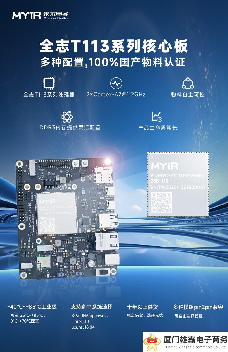 MYC-YT113X核心板及开发板,采用全志T113芯片,配备双核Cortex-A7处理器。全志T113系列芯片是目前比较受欢迎的国产入门级嵌入式工业芯片。米尔是基于T113芯片开发较早、提供配置最全的厂家,是目前唯一一家提供T113-S和T113-i两种芯片核心板的厂家。此外,T113-i的核心板兼容T113-S的核心板,同一个硬件设计,有多种更适合的选择。2种芯片,6种配置,选择多样。