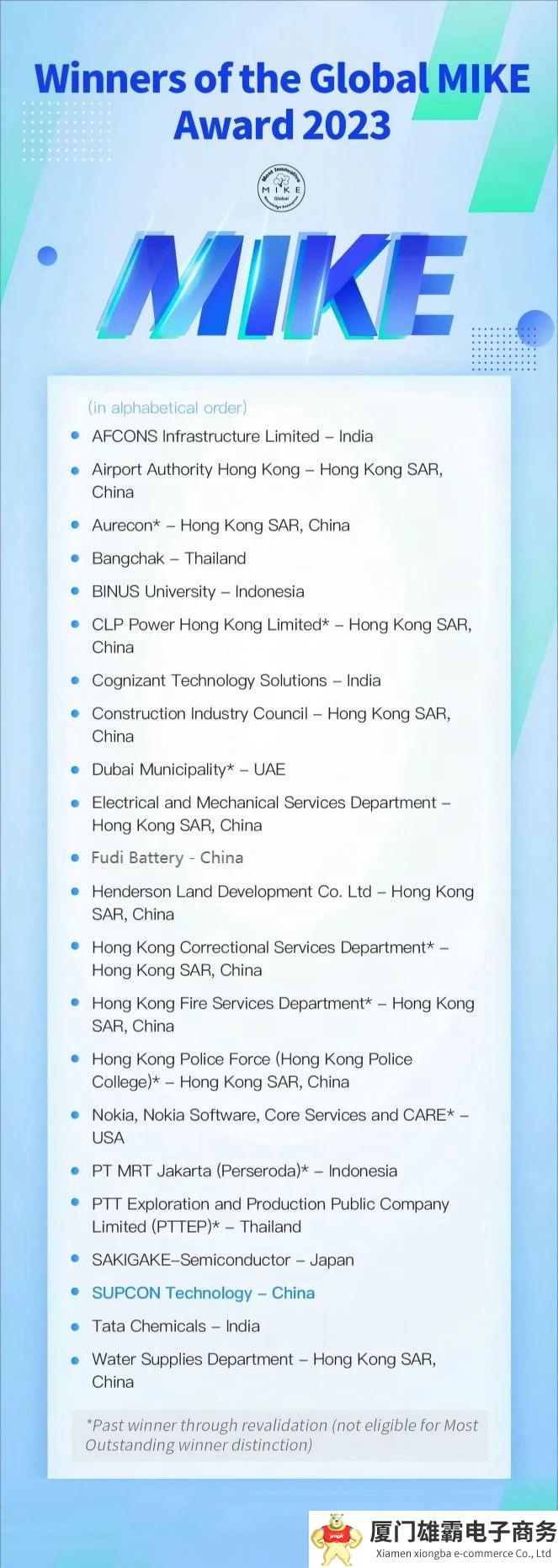 在2023年的全球MIKE大奖评选中,共有八个国家/地区参与,包括中国(内地)、中国香港、印度、印度尼西亚、日本、泰国、阿联酋和美国。经过严格的评选,共有22家组织脱颖而出,荣获2023全球MIKE大奖。在获奖的22家组织中,仅有2家来自中国内地,其中中控技术是其中之一。此外,Google、Amazon、Apple、Microsoft等国际知名企业也曾获得该奖项。