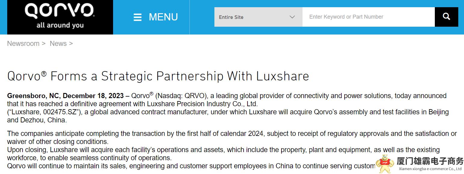 12月19日,美国射频巨头Qorvo宣布已售出中国北京和山东德州区域两所制造工厂的业务和资产,包括房产、厂房和设备以及现有员工,收购方为著名设备制造商立讯精密。
