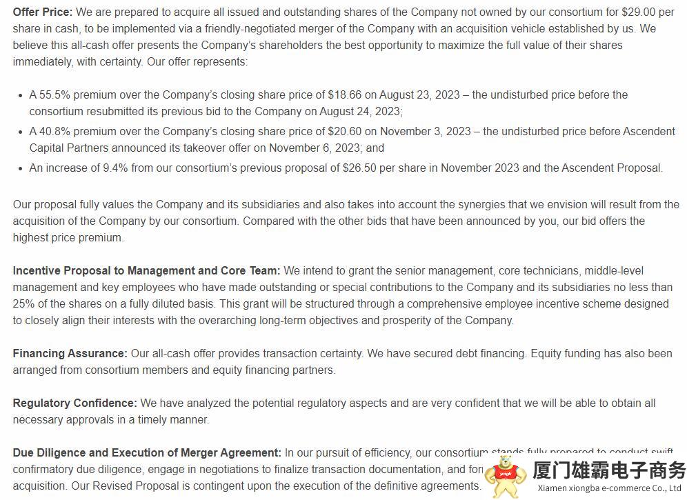 最高价格:较该财团此前于2023年11月8日向董事会提出的每股26.50美元的报价上涨9.4%,同样比Ascendent资本的竞争报价高出9.4%;