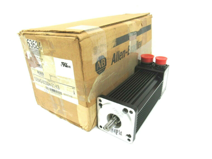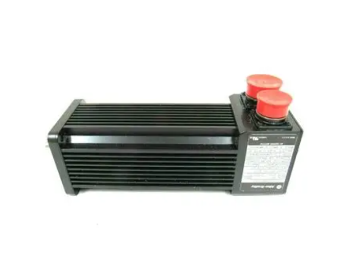 The Allen Bradley 1326AS-B330H-21 Low Inertia servo motor is a brushless AC synchronous servo motor with NdFeb permanent magnet rotor that delivers low motor inertia, peak torque and high acceleration in a compact unit. Designed for use in the Allen Bradley 1394 motion control system, the servo motor features a sinusoidal wound stator that provides smooth motor operation even at low speeds, as well as an IP66-rated housing built by TENV for harsh industrial environments. The 1326AS-B330H-21 has a three-phase rated input voltage of 460 volts AC, a rated output power of 0.9 kW, a continuous stall current of 2.1 amps, and a peak stall current of 6.0 amps. The servo motor has a rated rotor speed of 360 RPM at 5370 volts input and a maximum rotor speed of 6500 RPM at 460 volts rated motor input. The rated motor torque is 2.0N-m (18.0 lb/in), the peak system torque is 5.6N-m (50 lb/in), and the rated rotor inertia is 0.00009 Kg-m2 (0.0008 lb/in/s).